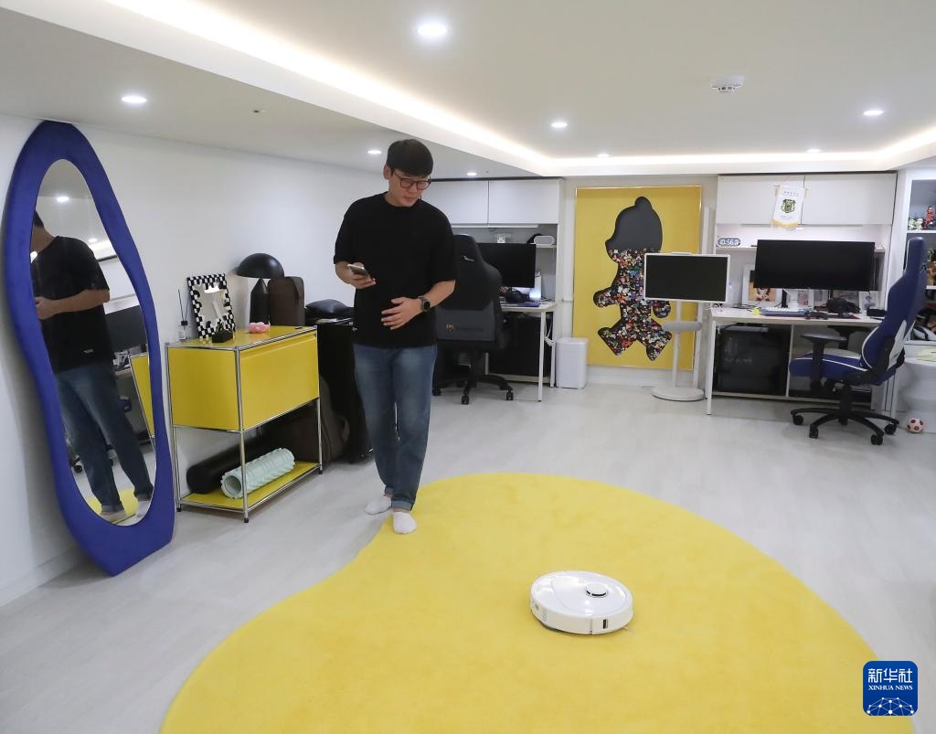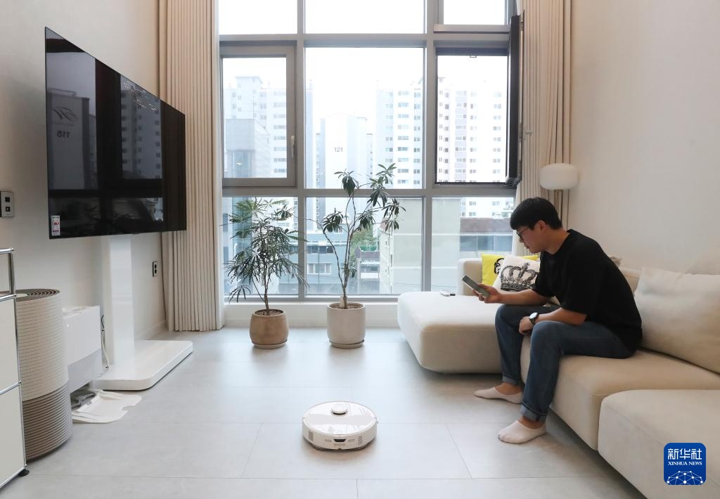 10月13日,韩国消费者闵普炫在首尔的家中使用扫地机器人。新华社记者 姚琪琳 摄