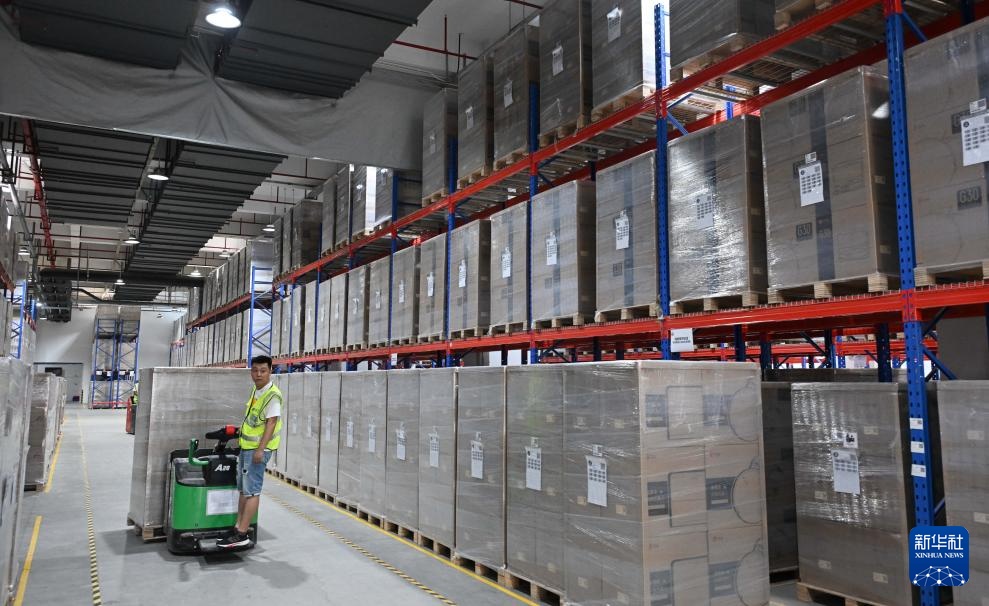 10月10日,在广东省惠州市,工作人员操作设备搬运石头科技扫地机器人产品。新华社记者 邓华 摄