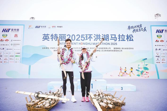 “来,想不想抬一下试试?”颁奖仪式上,来自鄂州的男子半程冠军喻桐,跟来自大连的女子半程冠军殷晓雨打趣地商量,随后两人一起发力,真的将这份有些特别的奖品抬了起来,引来现场一片欢笑。这份意外又特别的奖品,是组委会专门为每名全程和半程冠军们赠送的100斤洪湖莲藕。